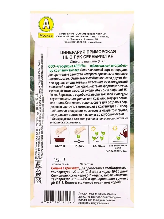 Семена цветов Цинерария Нью Лук серебристая (драже в пробирке) Спецсерия Benary, Ц/П,15 шт. 1094592