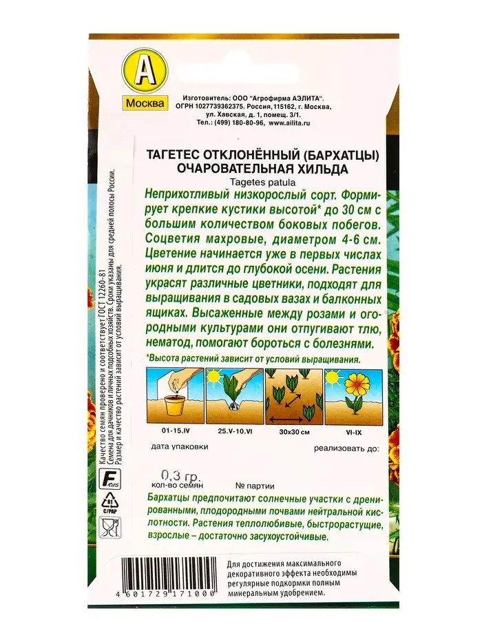Семена цветов Бархатцы Очаровательная Хильда отклоненные Золотая серия, Ц/П,0,3 г