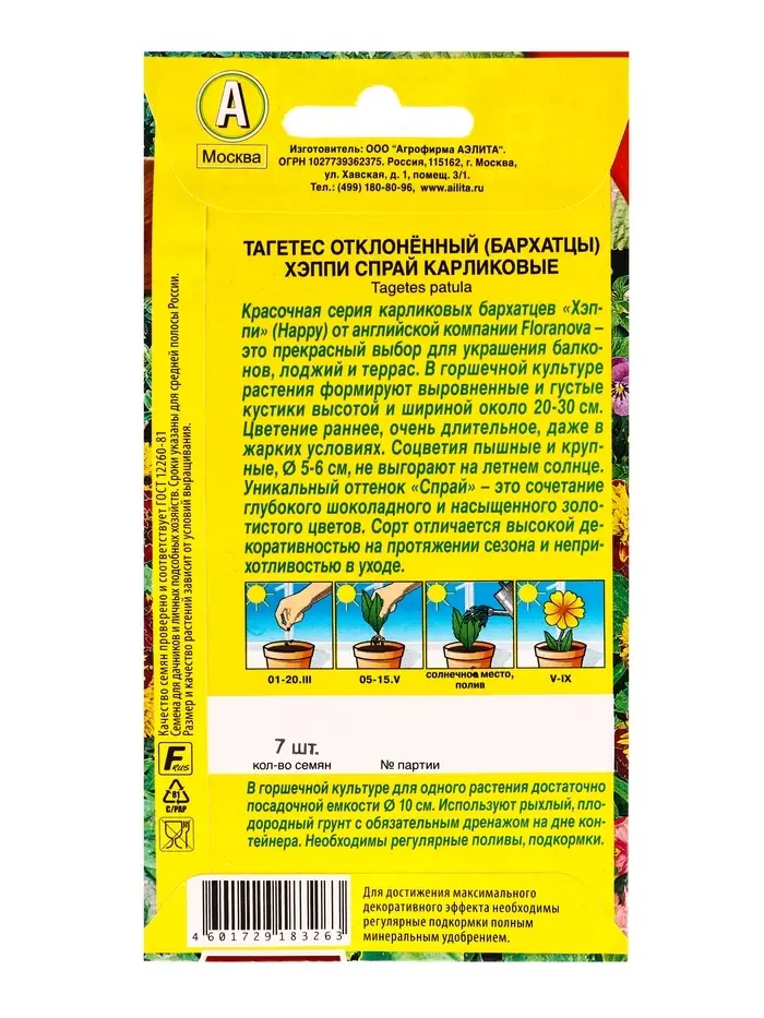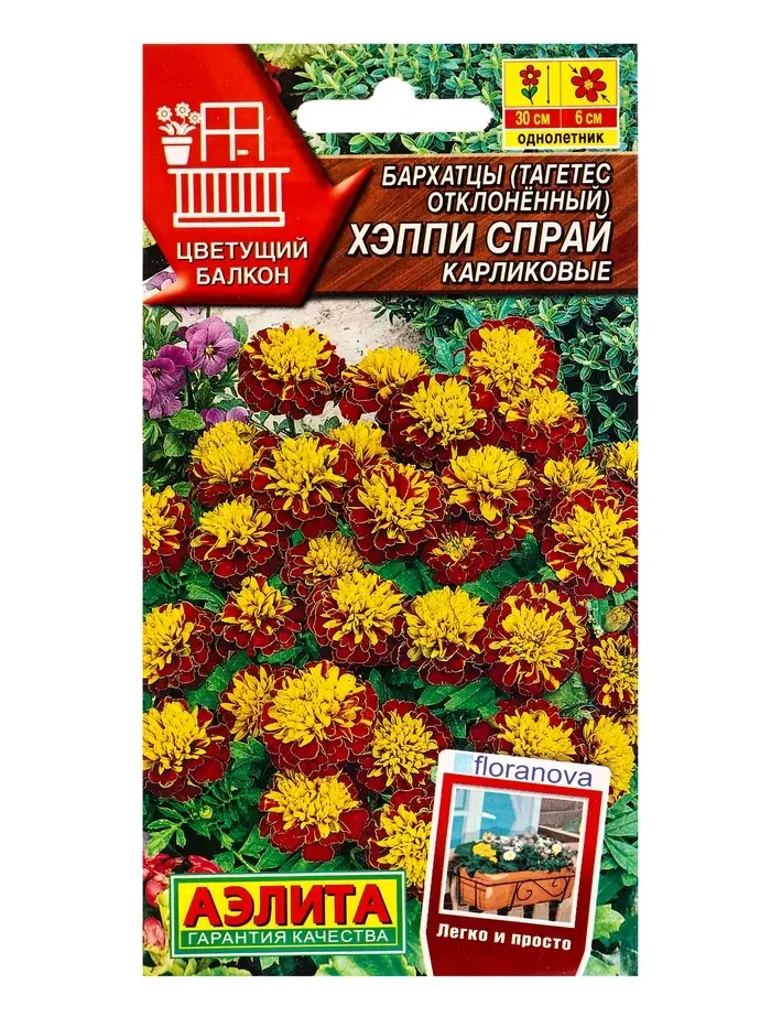 Семена цветов Бархатцы Хэппи спрай карликовые С. Floranova Цветущий балкон, Ц/П,7 шт.