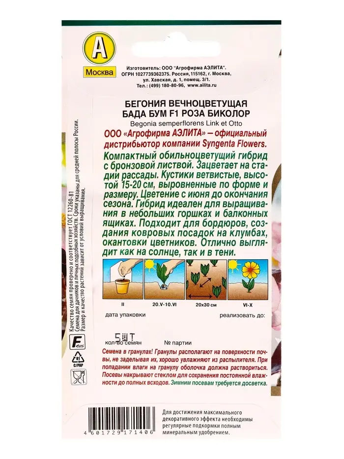 Семена цветов Бегония Бада бум F1 роза биколор (драже в пробирке) Спецсерия Syngenta, Ц/П,5 шт. 109