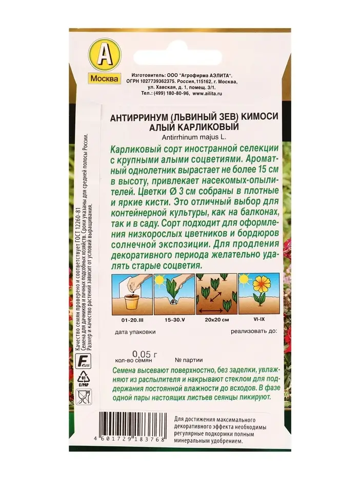 Семена цветов Львиный зев Кимоси алый карликовый Золотая серия, Ц/П,0,05 г