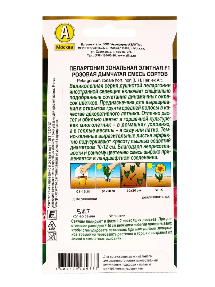 Семена цветов Пеларгония Элитная F1 розовая дымчатая, смесь сортов Мн Золотая серия, Ц/П,5 шт. 10945