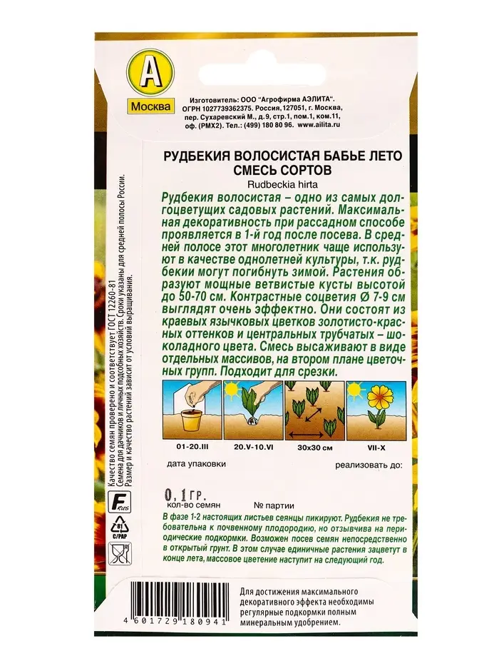 Семена цветов Рудбекия Бабье лето, смесь сортов Золотая серия, Ц/П,0,1 г
