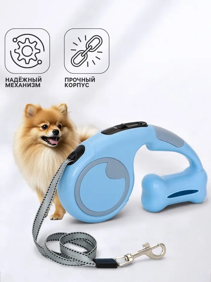 Голубой корпус легко найти в сумке или на скамейке, а ещё он не теряет свежесть вида со временем — не пачкается и не выцветает под солнцем. «Косточка» — это поводок, в котором всё продумано: от веса до мелочей. Идеален для утренних маршрутов, городских прогулок и поездок: компактный, сбалансированный, без лишнего.
