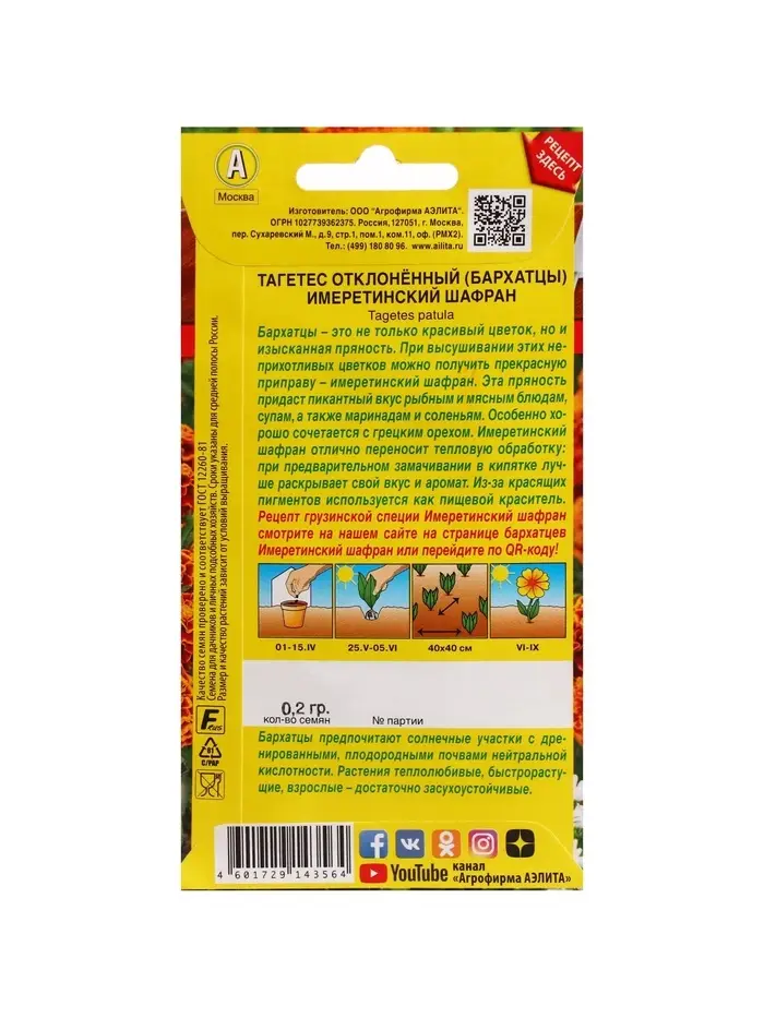 Набор семян Бархатцы "Имеретинский шафран", отклоненные, , 5 шт.
