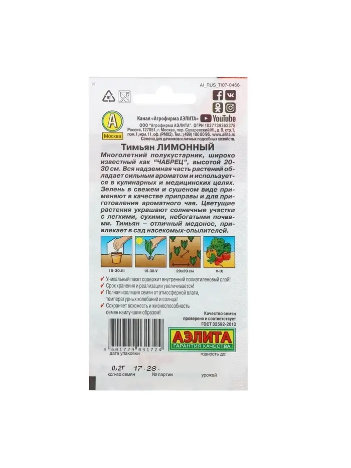 Набор семян Тимьян "Лимонный", пряность, 5 шт.
