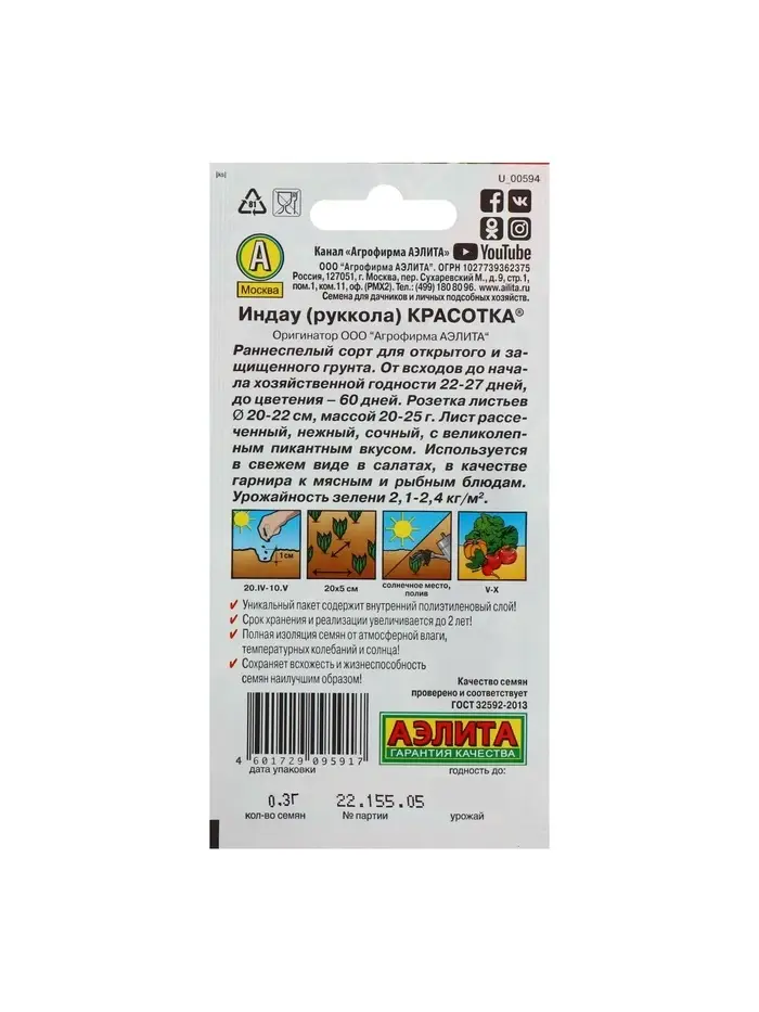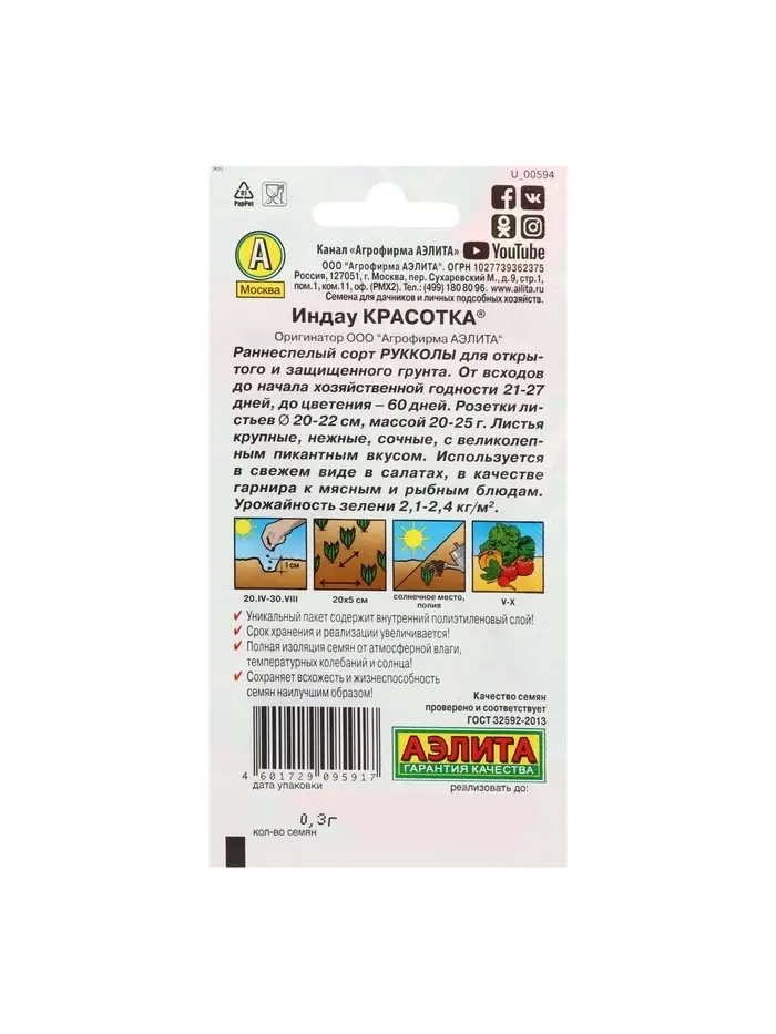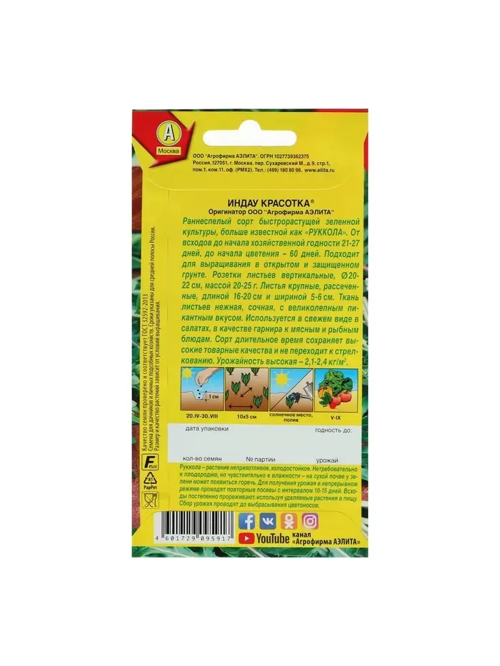 Набор семян Индау (Руккола) "Красотка", 5 шт.