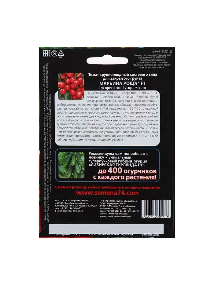 Набор семян Томат "Марьина Роща" F1 раннеспелый, крупноплодный, кистевого типа, 3 шт.