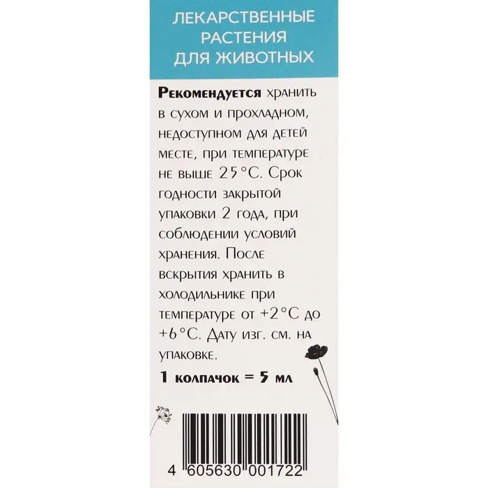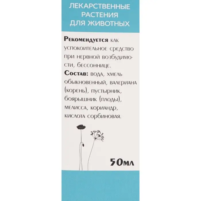 Состав: корень валерианы, пустырник, пион уклоняющийся, хмель обыкновенный, мелиса, кориандр.Валериана уменьшает рефлекторную возбудимость, обладает успокаивающим действием при неврозах, при нервном возбуждении.Пустырник. Его действующим началом являются эфирные масла, дубильные и горькие вещества, алкалоиды, гликозиды. Регулирует функциональное состояние центральной нервной системы. Успокаивающее средство.Пион уклоняющийся обладает противосудорожным, успокаивающим, обезболивающим свойствами. Успокаивает нервную систему, тонизирует сердечно-сосудистую систему.Хмель обыкновенный применяется как седативное, противовоспалительное средство, возбуждающее аппетит, усиливающее пищеварение. Обладает мочегонным, снотворным, противосудорожным, болеутоляющим действиями.Мелисса снижает артериальное давление, показана при неврозах различного происхождения. Успокаивающее, спазмолитическое средство.Кориандр усиливает секрецию пищеварительного тракта, болеутоляющее и антисептическое действие. Обладает успокаивающим и противосудорожным действием.Рекомендуется как успокоительное средство при нервной возбудимости для снятия агрессивности, беспокойства, улучшения сна. Показания к применению: применять в течение месяца 1 раз в день.1 колпачок в пищу при весе до 5 кг;2 колпачка в пищу при весе более 5 кг.1 колпачок — 5 мл. Условия хранения: хранить в прохладном месте. Срок годности 2 года.