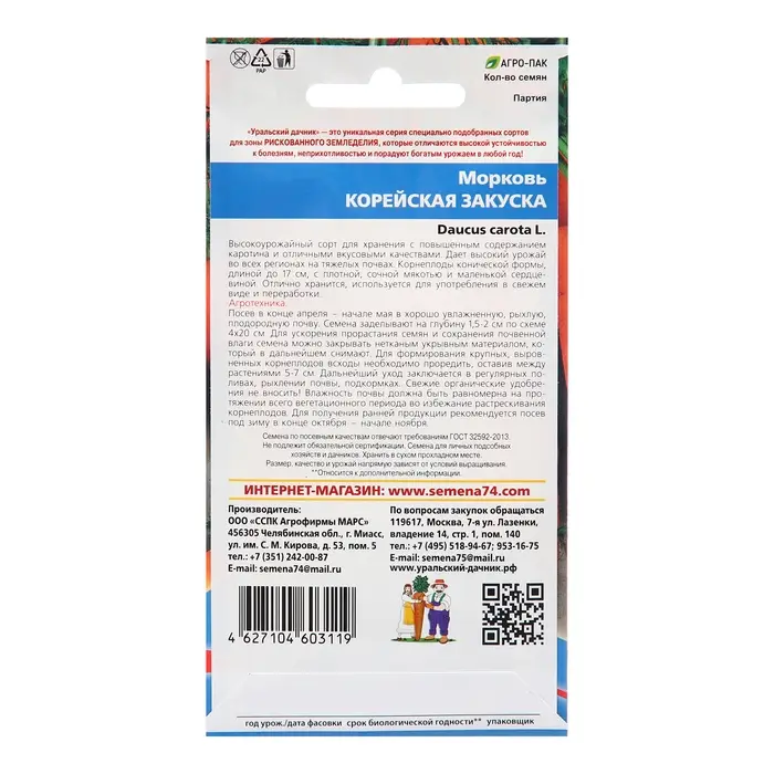 Семена Морковь Корейская закуска. Высокоурожайный сорт для хранения с повышенным содержанием каротина и отличными вкусовыми качествами. Дает высокий урожай во всех регионах на тяжелых почвах. Корнеплоды конической формы, длиной до 17 см, с плотной, сочной мякотью и маленькой сердцевиной.