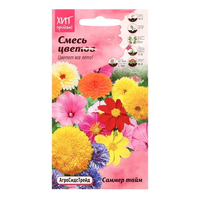 Смесь Саммер тайм – это смесь однолетних цветочных культур, которая наполнит Ваш сад яркими красками. В состав смеси входят неприхотливые, простые в выращивании и уходе цветы. Высота растений 40-50 см. Выберите свободное место на Вашем участке и просто посейте семена. Спустя некоторое время Вы будете наслаждаться буйством красок и фактур, одни цветы дополняют другие. Цветение продолжается все лето. В состав смеси входят: василек Блю бол, георгина Веселые ребята, календула махровая смесь, амми Белая, подсолнечник декоративный Плюшевый мишка, лаватера Монт Блан, лаватера Красотка. Агротехника: Неприхотливые культуры, просты в выращивании и не требуют тщательного ухода. Семена высевают в грунт на постоянное место в апреле – мае. Всходы появляются через 7-10 дней. Через 2–3 недели проводят прореживание, чтобы расстояние между растениями было 20 см. Штрих-код - 4650091484201