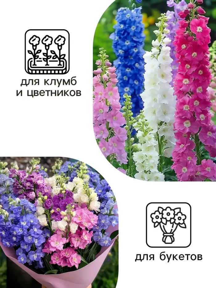 Элегантные высокие однолетние дельфиниумы с яркими разнообразными по окраске соцветиями 30 – 35 см высотой до 120 см характеризуются очень длительным цветением с конца июня по сентябрь. Дельфиниум часто используют для посадки вдоль стен и оград, а также для создания высоких групповых посадок на газоне. Также дельфиниумы велеколепны в букетах, в вазе стоят до 10 дней._x005F_x000B__x005F_x000B_Агротехника: Дельфиниум сеют непосредственно в грунт в апреле –мае по 3-4 штуки на расстоянии 30-35 см друг от друга. Всходы появляются через 20-30 дней. Предпочитает рыхлые, хорошо дренированные почвы, солнечные, с лёгким затенением в полуденные часы и безветренные места. Для прорастания им необходимы темнота, прохладный воздух не более 10-12°С и влажная почва. Предпочтительны солнечные места с легким затенением в полдень и плодородная, хорошо дренированная почва. Дельфиниумы очень холодостойки и неприхотливы. Штрих-код – ГОСТ -