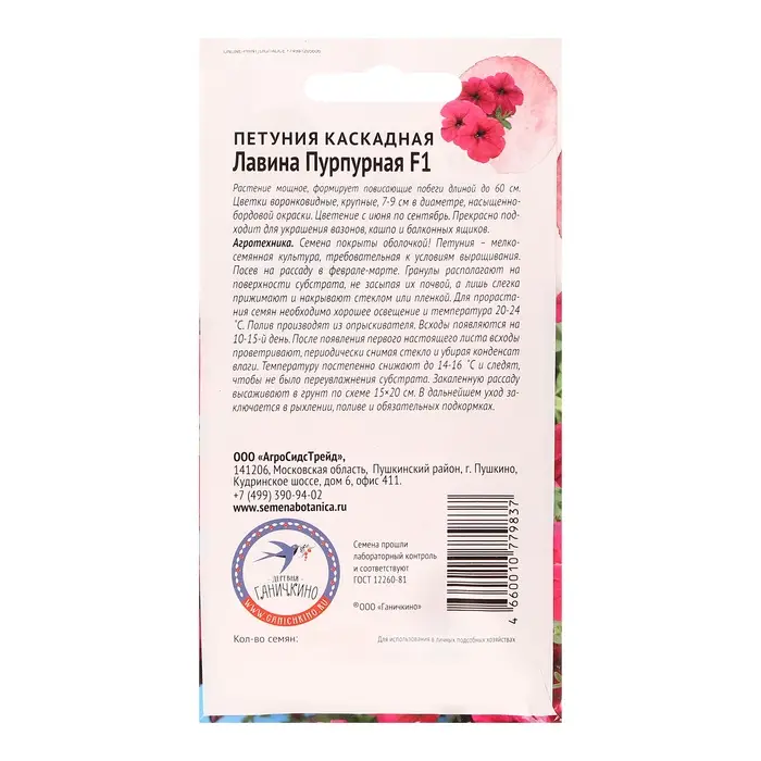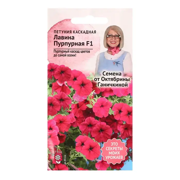 Растение мощное, формирует повисающие побеги длиной до 60 см. Цветки воронковидные, крупные, 7-9 см в диаметре, пурпурно-красные с белой звездой. Цветение с июня по сентябрь. Прекрасно подходит для украшения вазонов, кашпо и балконных ящиков. Агротехника: Семена покрыты оболочкой! Петуния – мелкосемянная культура, требовательная к условиям выращивания. Посев на рассаду в феврале-марте. Гранулы располагают на поверхности субстрата, не засыпая их почвой, а лишь слегка прижимают и накрывают стеклом или пленкой. Для прорастания семян необходимо хорошее освещение и температура 20-24˚С. Полив производят из опрыскивателя. Всходы появляются на 10-15 день. После появления первого настоящего листа всходы проветривают, периодически снимая стекло и убирая конденсат влаги. Температуру постепенно снижают до 14-16˚С и следят, чтобы не было переувлажнения субстрата. Закаленную рассаду высаживают в грунт по схеме 15×20 см. В дальнейшем уход заключается в рыхлении, поливе и обязательных подкормках.