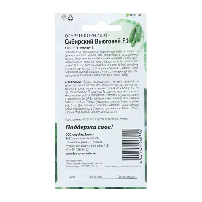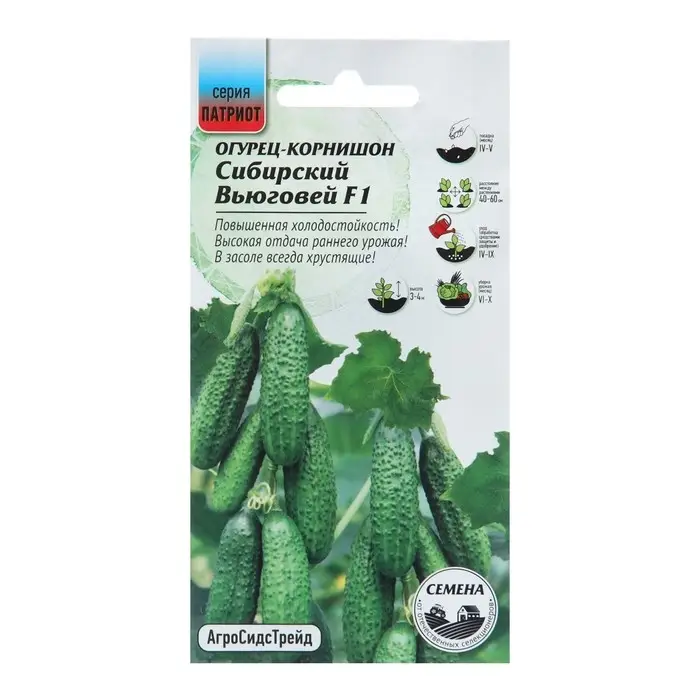 ОГУРЕЦ-КОРНИШОНСибирский Вьюговей F1Cucumis sativus L.Великолепный раннеспелый партенокарпический гибрид сдружной отдачей урожая, для открытого и защищённогогрунта. Огурчиков на плетях видимо-невидимо. Плоды круп-нобугорчатые, красивой ярко-зелёной окраски, белошипые,длиной 8-12 см, высоких вкусовых качеств. Гибрид устойчивк ложной мучнистой росе, вирусу огуречной мозаики, легкопереносит перепад дневных и ночных температур. Для кон-сервирования, соления и потребления в свежем виде.Агротехника. Огурцы выращивают, высевая семенами вгрунт или через рассаду. Для получения рассады семена вы-севают в конце марта – начале апреля на глубину 1-2 смпри температуре 25 градусов. Рассаду высаживают в грунт,когда минует угроза заморозков. Семенами огурец высеваютв прогретую до 14-15 градусов почву в конце мая. Глубиназаделки 1-1,5 см. Посевы укрывают плёнкой. Схема посадки60х15 см. Для отличных урожаев необходим полив тёплойводой, подкормки раз в 2 недели, прополки, рыхление. Нерегу-лярный сбор плодов снижает урожайность.Срок хранения до 8 лет в сухом прохладном месте.Поддержи свое!