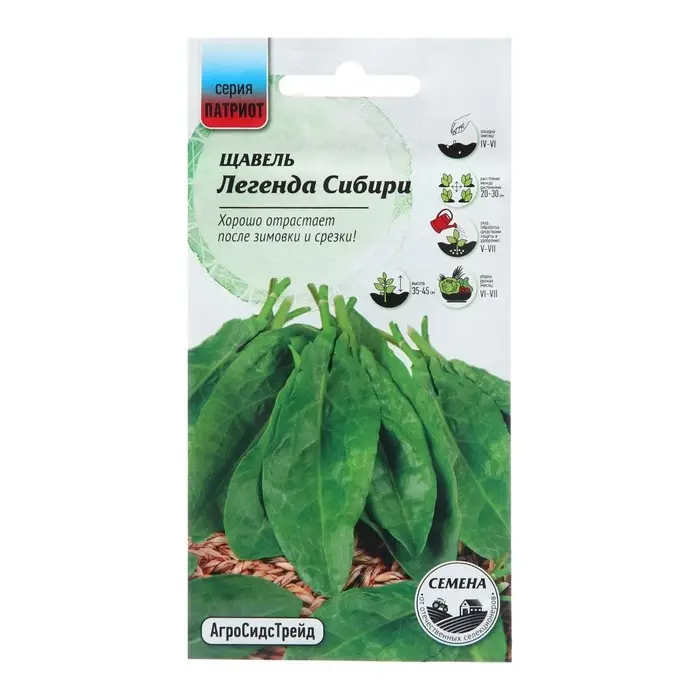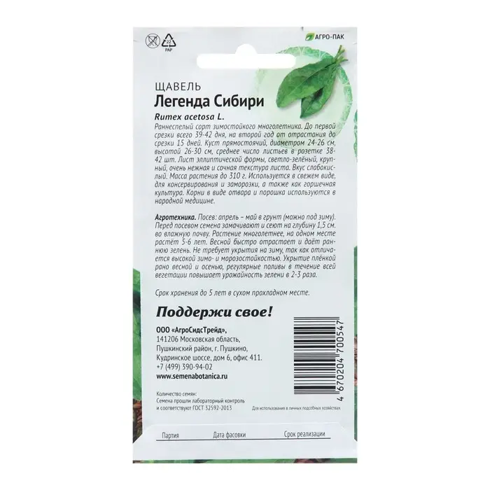 ЩАВЕЛЬЛегенда СибириRumex acetosa L.Раннеспелый сорт зимостойкого многолетника. До первойсрезки всего 39-42 дня, на второй год от отрастания досрезки 15 дней. Куст прямостоячий, диаметром 24-26 см,высотой 26-30 см, среднее число листьев в розетке 38-42 шт. Лист эллиптической формы, светло-зелёный, круп-ный, очень нежная и сочная текстура листа. Вкус слабокис-лый. Масса растения до 310 г. Используется в свежем виде,для консервирования и заморозки, а также как горшечнаякультура. Корни в виде отвара и порошка используются внародной медицине.Агротехника. Посев: апрель – май в грунт (можно под зиму).Перед посевом семена замачивают и сеют на глубину 1,5 см.во влажную почву. Растение многолетнее, на одном местерастёт 5-6 лет. Весной быстро отрастает и даёт ран-нюю зелень. Не требует укрытия на зиму, так как отлича-ется высокой зимо- и морозостойкостью. Укрытие плёнкойрано весной и осенью, регулярные поливы в течение всейвегетации повышает урожайность зелени в 2-3 раза.Срок хранения до 5 лет в сухом прохладном месте.Поддержи свое!