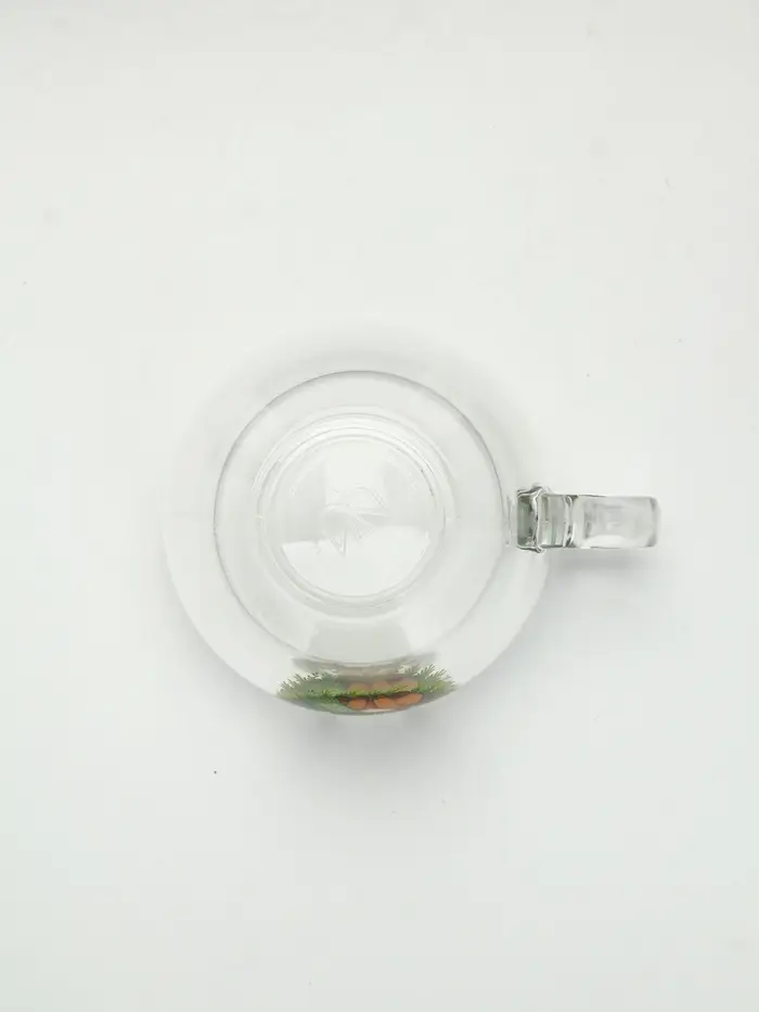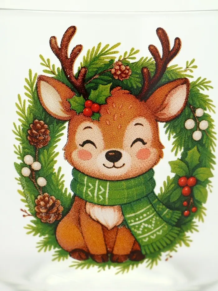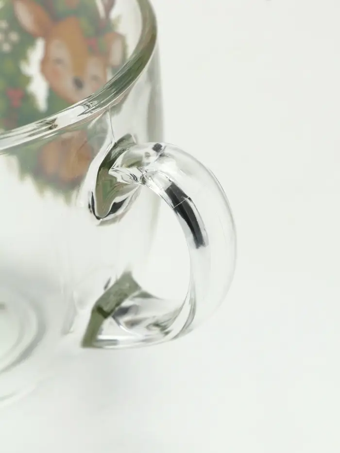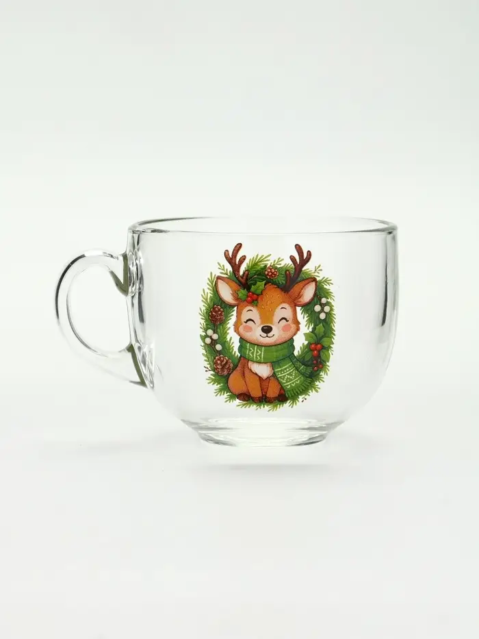 Кружка «Оленёнок» — это тихое рождественское утро, застывшее в стекле. Прозрачное основание, как окно, за которым медленно падает снег, и на нём — оленёнок с венком из омелы: не сказочный персонаж из открытки, а живой, чуть робкий, с закрытыми глазами и мягкими очертаниями, будто только что вышел из леса, чтобы заглянуть в дом. Никаких надписей, никаких дат — только образ. Потому что некоторые чувства не требуют слов. Они — в лёгком наклоне головы, в венке, который держится не на верёвке, а на доверии.