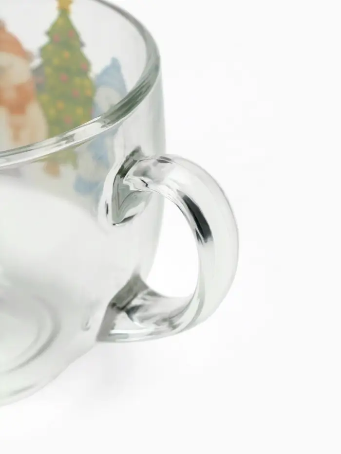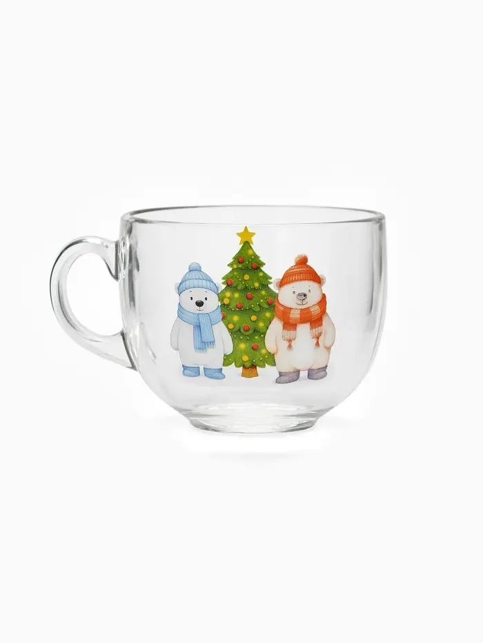 Кружка «Мишки в лесу» — это зимний лес, умещённый в прозрачное стекло. На фоне чистой поверхности — два мишки у ёлки: живые, чуть неуклюжие, с мягкими контурами и тёплыми тенями. Никаких надписей, никаких дат. Только сцена — тихая, как первый снег, и такая же настоящая.