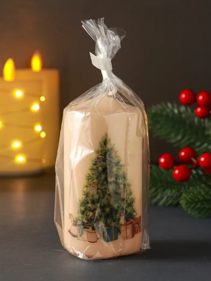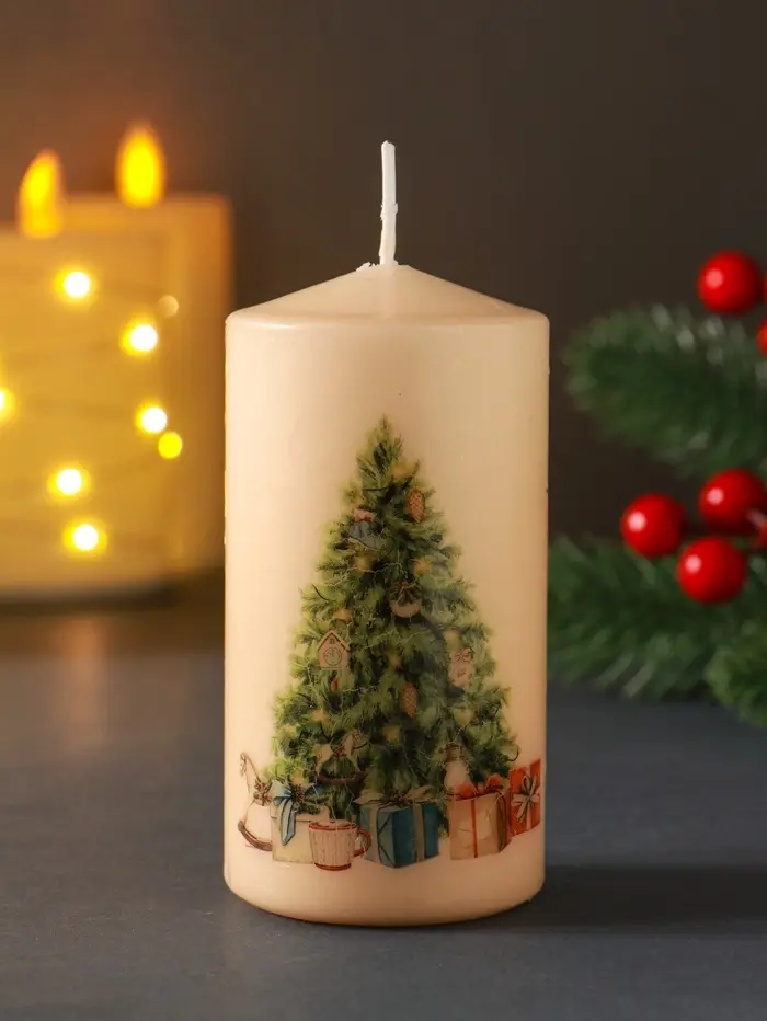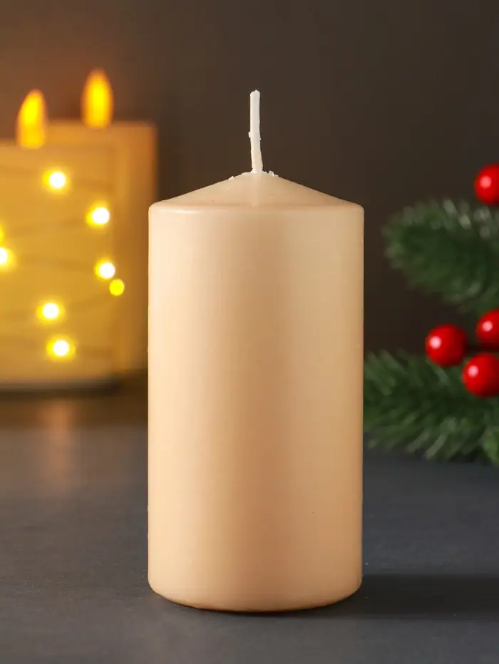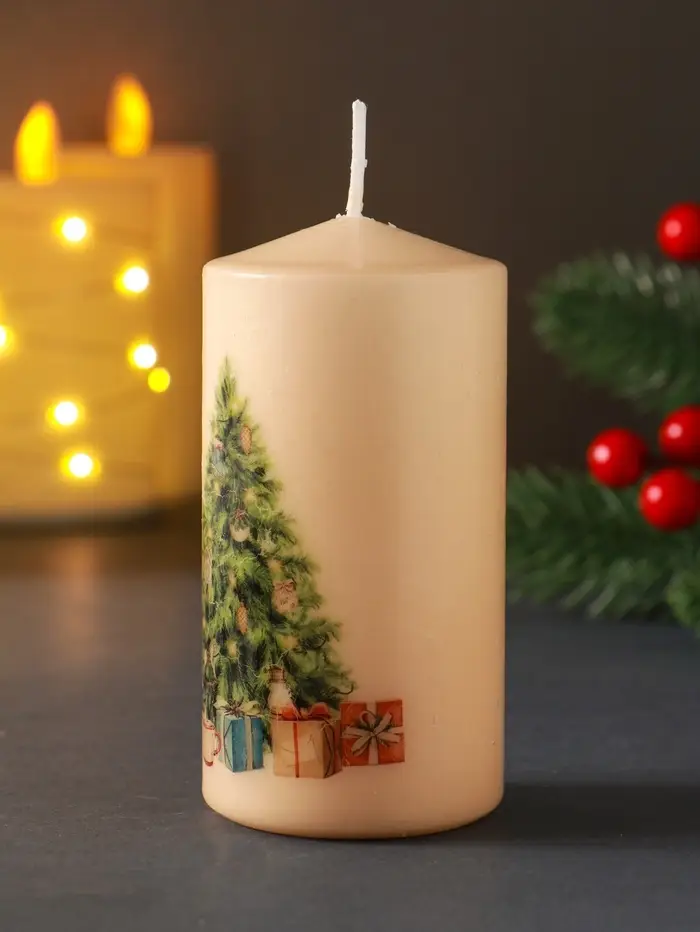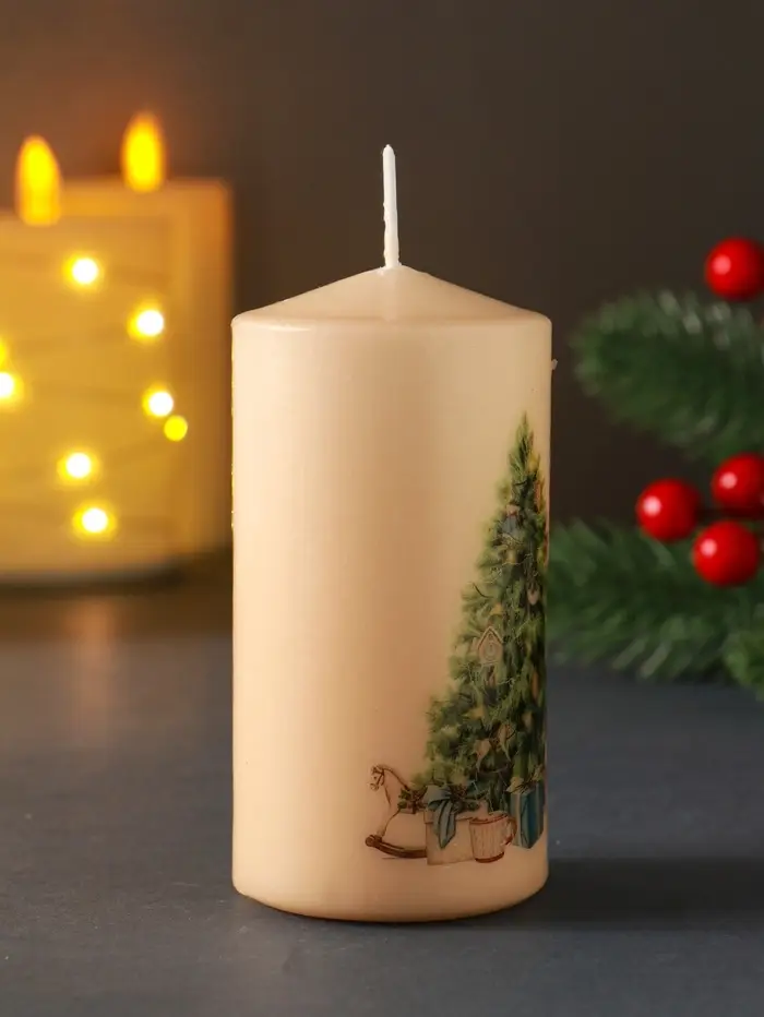 Свеча столб 50х100мм с декором, мишка, бежевая