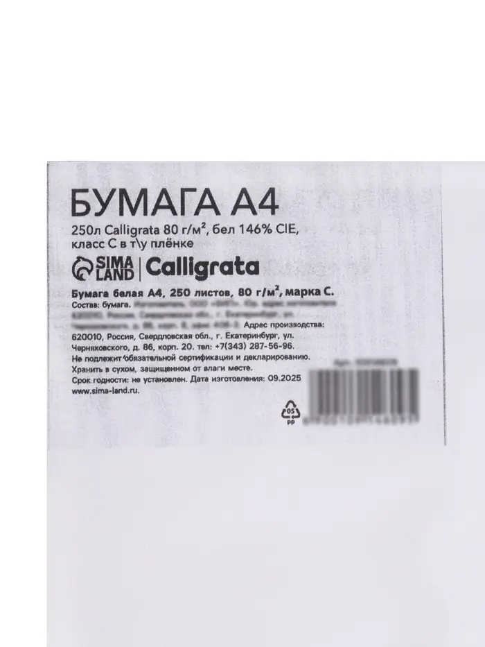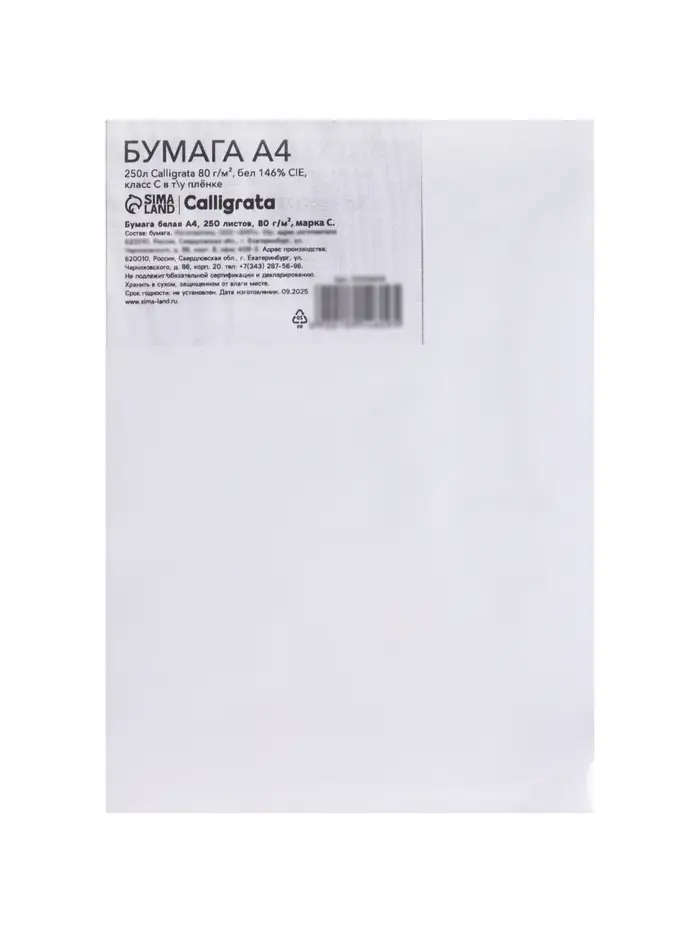 Бумага А4 250 листов, Calligrata 80 г/м², белизна 146% CIE, класс С, в пленке