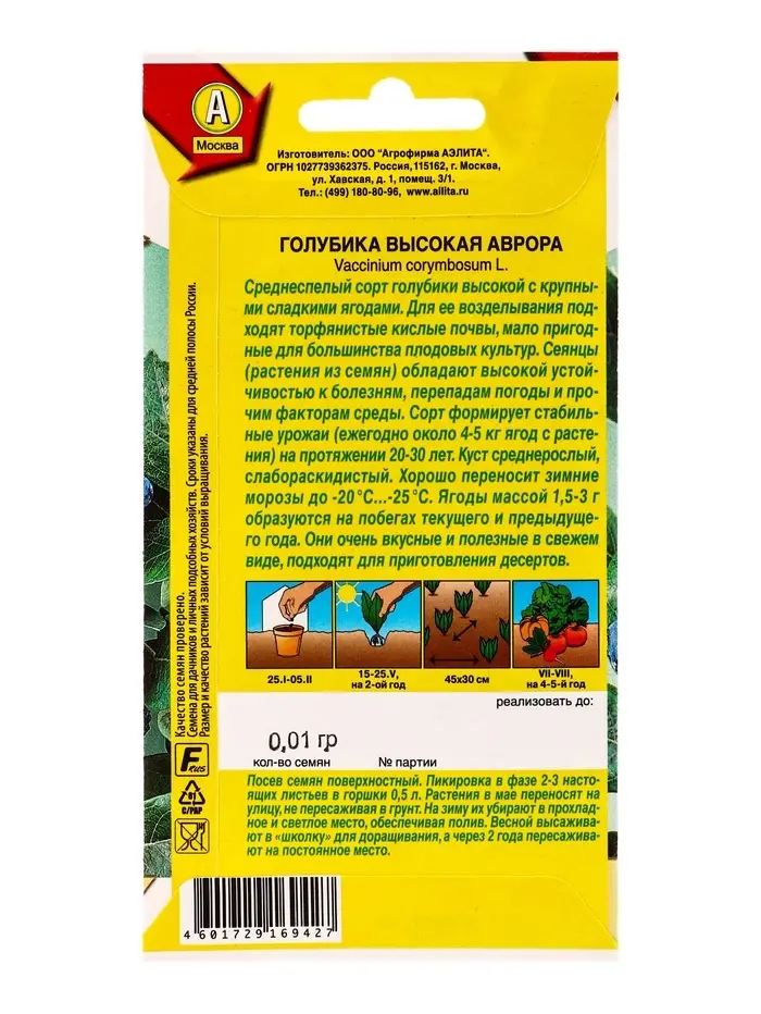 Семена Голубика высокая Аврора Сладкоежка, Ц/П,0,01 г