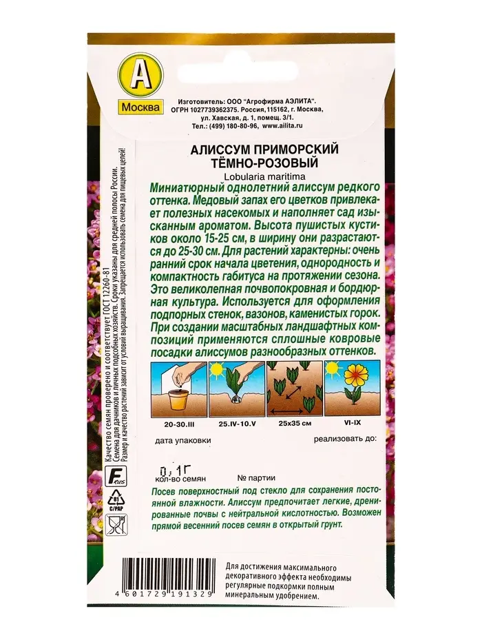 Семена цветов Алиссум приморский Тёмно-розовый Золотая серия, Ц/П,0,1 г