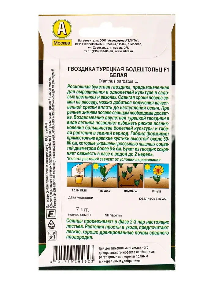 Семена цветов Гвоздика турецкая Бодештольц F1 белая Золотая серия, Ц/П,7 шт.