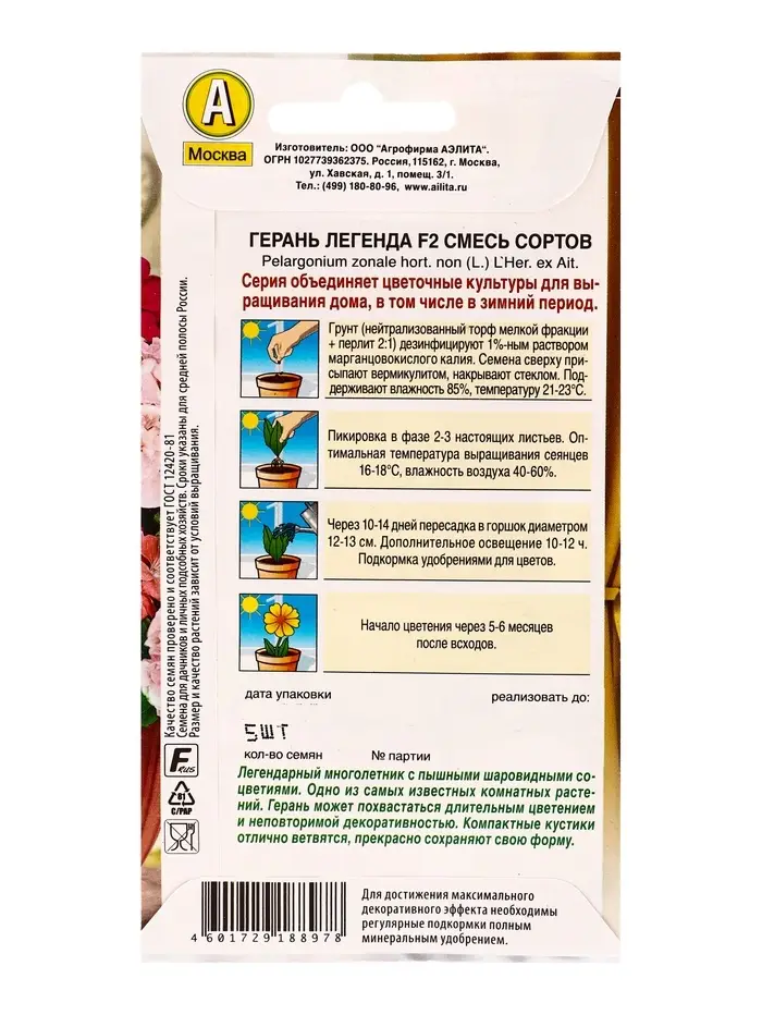 Семена цветов Герань Легенда F2, смесь сортов Мн Зимний сад, Ц/П,5 шт.