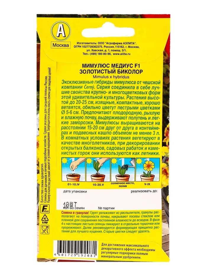 Семена цветов Мимулюс Медиус F1 золотистый биколор (драже) С. Cerny Цветущий балкон, Ц/П,10 шт. 1094