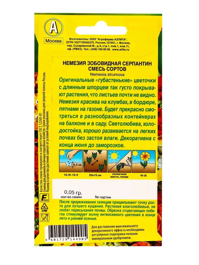 Семена цветов Немезия Серпантин, смесь сортов , Ц/П,0,05 г