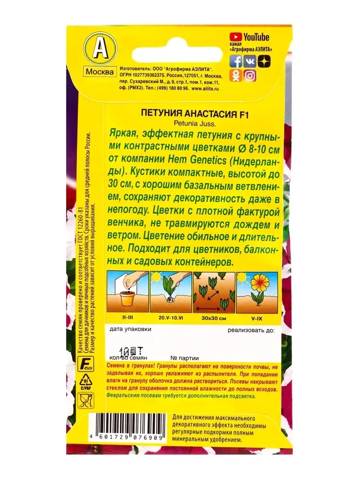 Семена цветов Петуния Анастасия F1 крупноцветковая (драже в пробирке), Ц/П,10 шт.