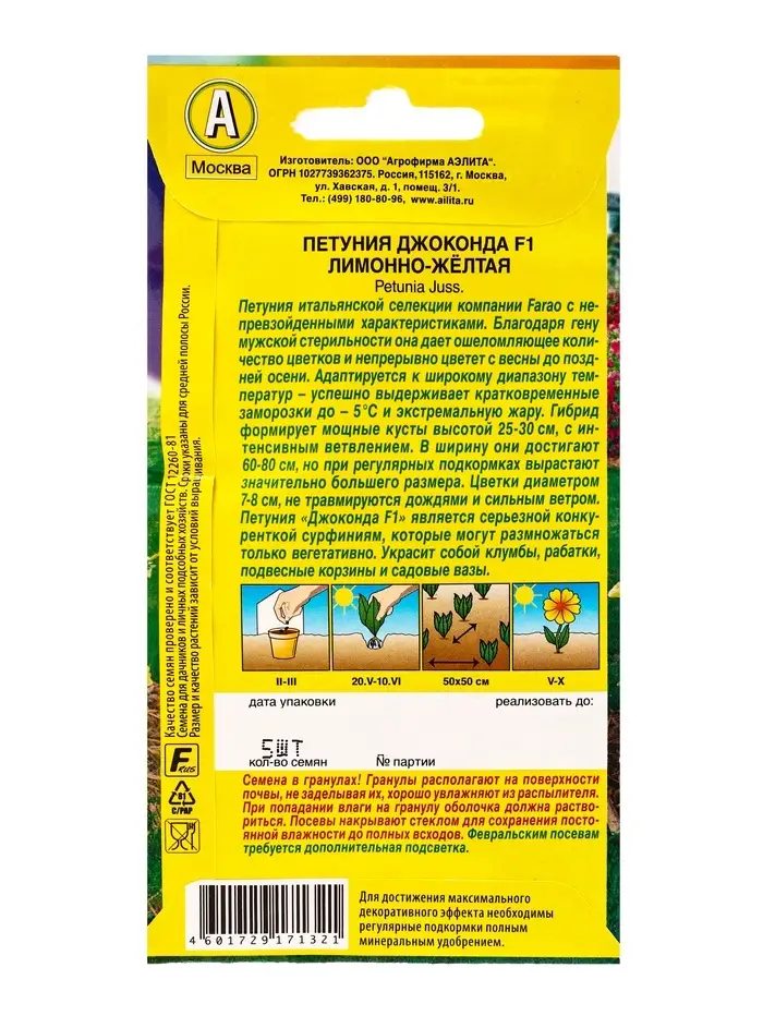 Семена цветов Петуния Джоконда F1 лимонно-желтая (драже в пробирке), Ц/П,5 шт.
