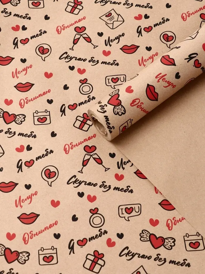 Крафт бумага "Я люблю тебя" черный/красный цв. на коричневом фоне 0,68 х 10 ±5% м, 60 гр