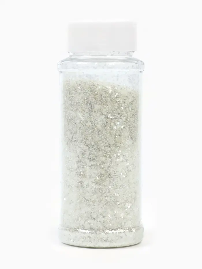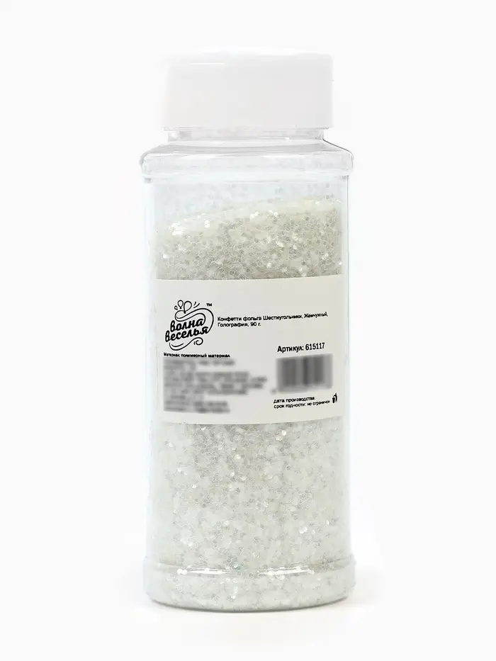 Жемчужное голографическое конфетти в форме шестиугольников — как ”рассыпанный свет, отражённый от поверхности морской пены в полдень“. Его основа — тёплый белый с перламутровым отливом, но при малейшем движении или смене освещения на грани вспыхивают искры: розоватые, золотистые, синеватые — как отблески на жемчужине в ладони. Такой наполнитель не украшает — он *оживляет*: добавляет глубину прозрачным объектам, превращает статичную упаковку в динамичную композицию, а лизун — в игрушку с внутренним сиянием.