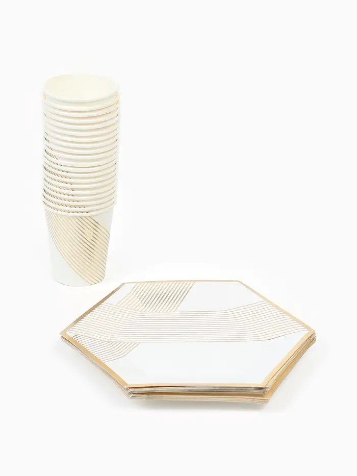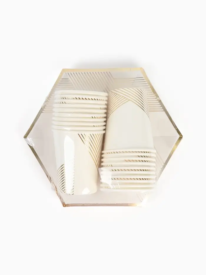 Набор посуды для праздника на 20 персон, белый с золотом (тарелки 23 см, стакан 250 мл)