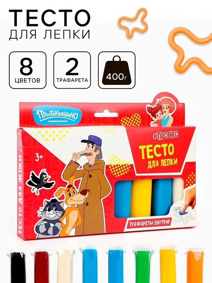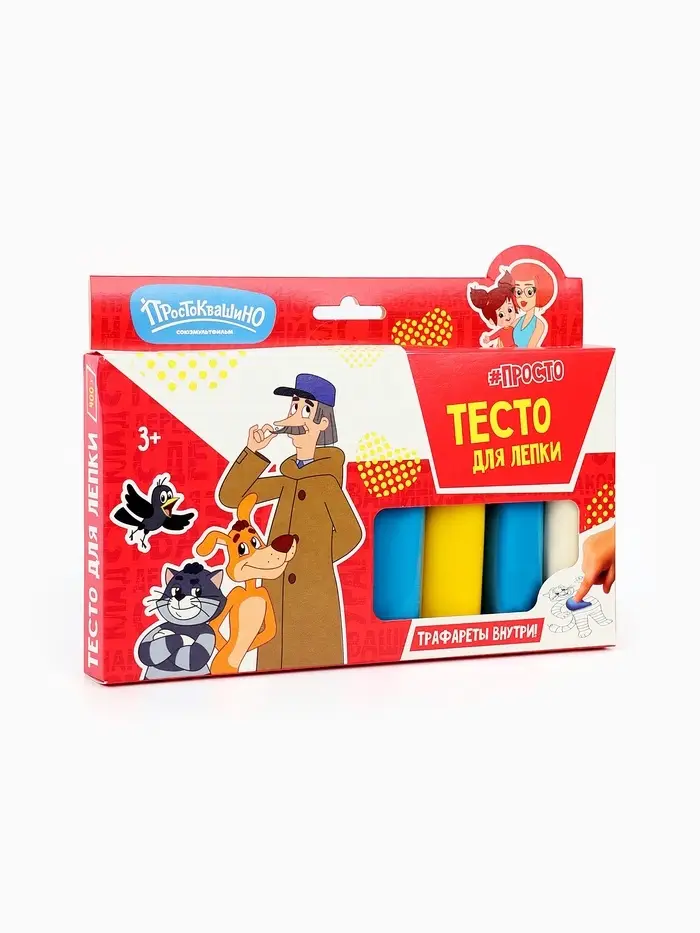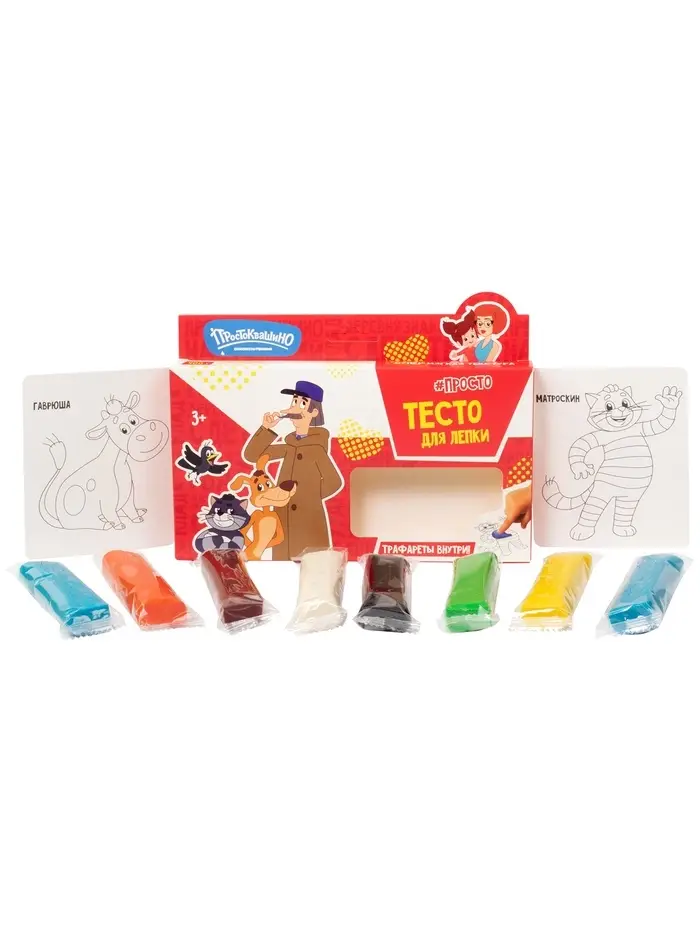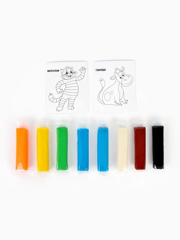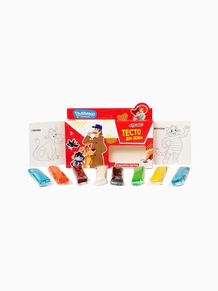 - Любимые герои мультфильма «Простоквашино» — делают процесс лепки интереснее и мотивируют малыша к творчеству.