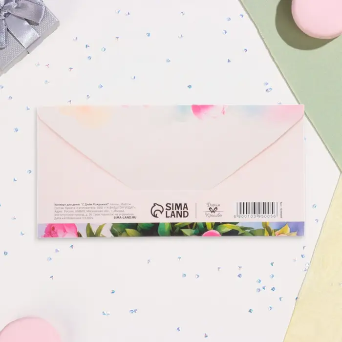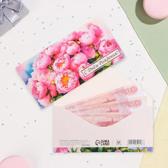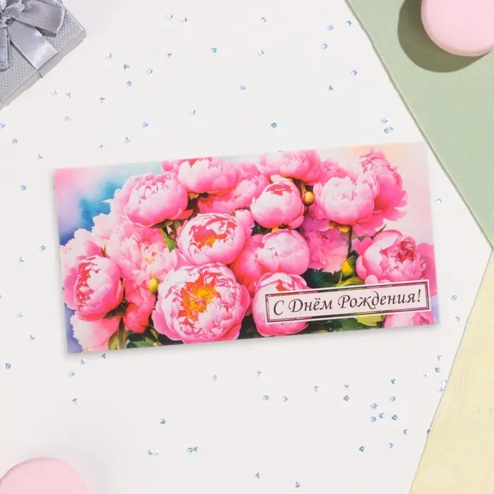 Конверт для денег "С Днём Рождения!" пионы, 16х8 см