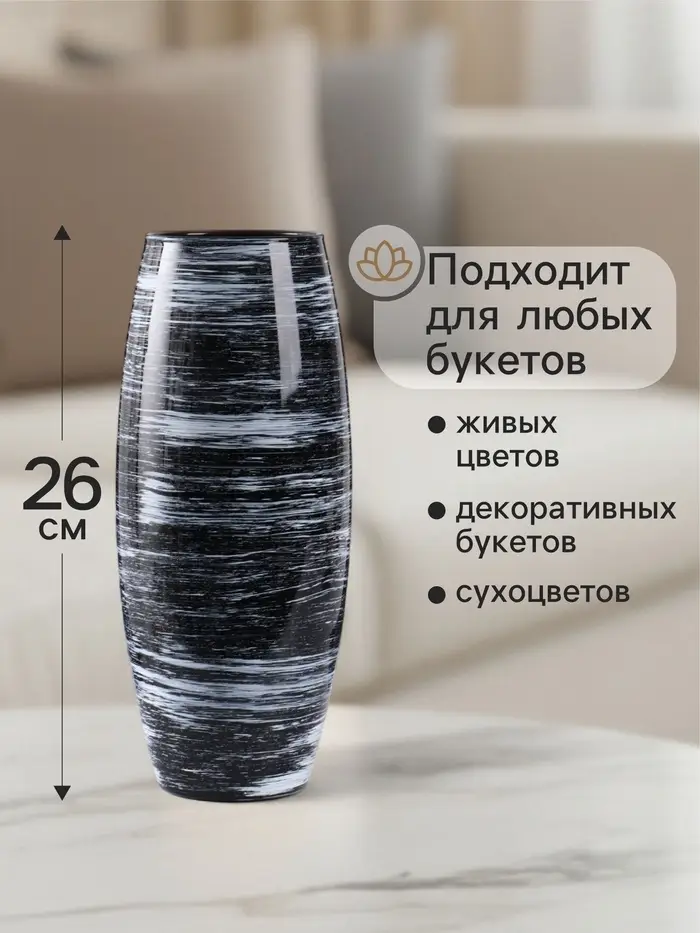 - Идеальный размер: Высота 26 см делает эту вазу универсальным решением для размещения на столе или полке. Она легко впишется в любое пространство, не перегружая его, но добавляя стильный акцент.