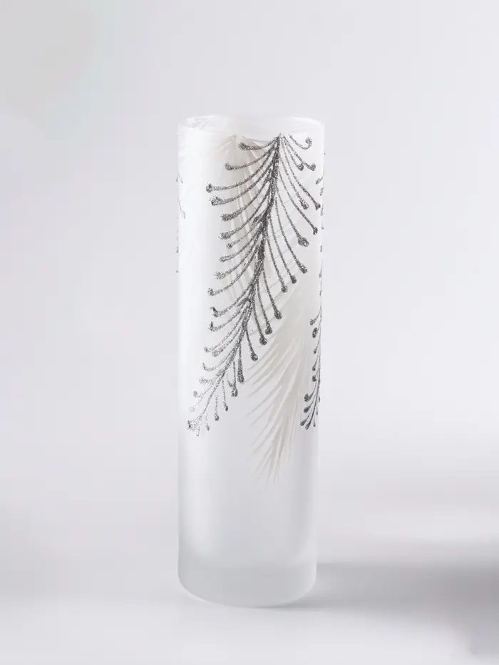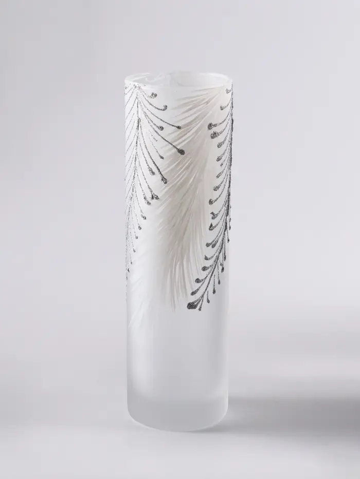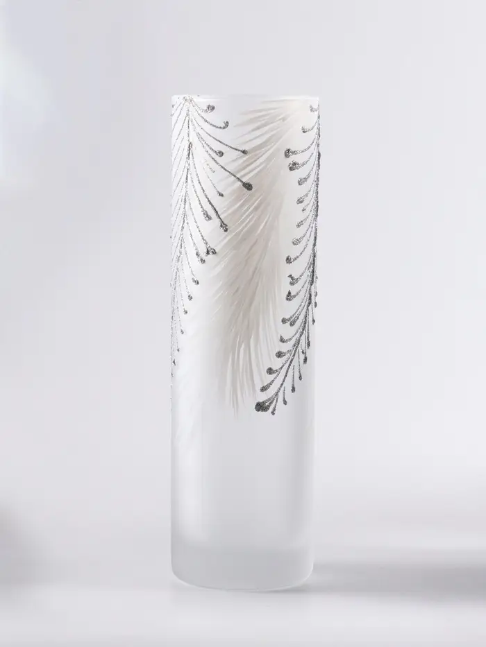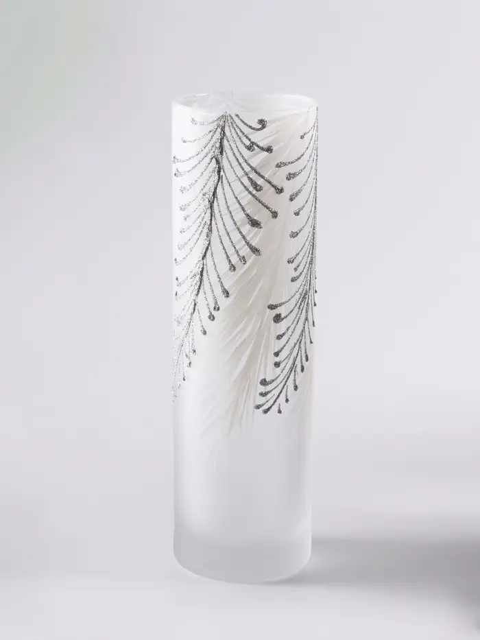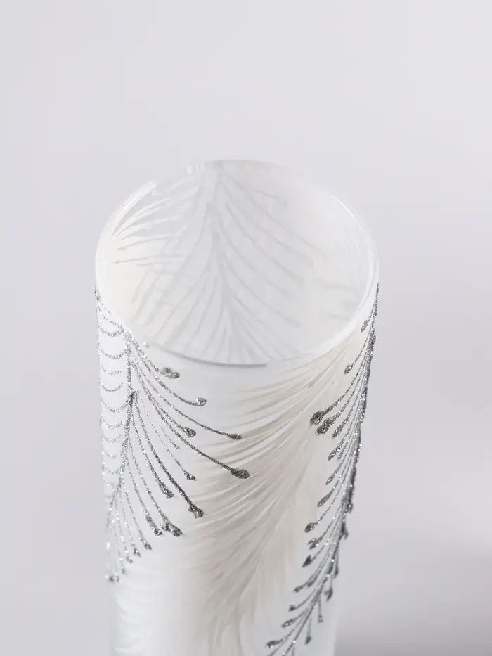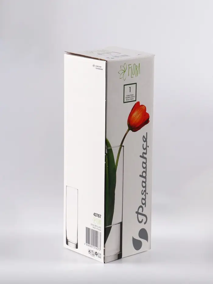 Эта высокая белая ваза для цветов придаст интерьеру воздушность и лёгкость. Её прозрачные стенки и строгий силуэт подчеркнут красоту букета, не отвлекая на себя внимание. Идеальный сосуд для современных аранжировок с длинными стеблями.