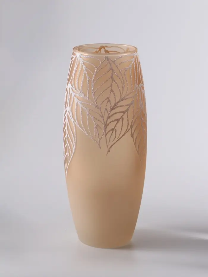 - Деликатная фактура «пудра»: Матовое напыление на стекле создаёт эффект лёгкой дымки и бархатистой поверхности. Ваза приятна на ощупь, на ней практически не видны следы от пальцев и воды.