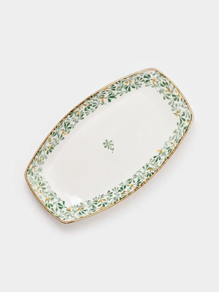 Сервировочное блюдо «Гармония лепестков» — практичное и эстетичное решение для подачи закусок, нарезок или десертов на общий стол. Его вытянутая фигурная форма (30×18 см) и небольшая глубина (3,5 см) создают удобную зону для компоновки блюд, а нежный цветочно-растительный орнамент в бело-зелёной гамме добавляет лёгкую декоративность без излишеств. Фарфор обеспечивает прочность, а глазурованная поверхность сохраняет свежесть рисунка даже при частом использовании.