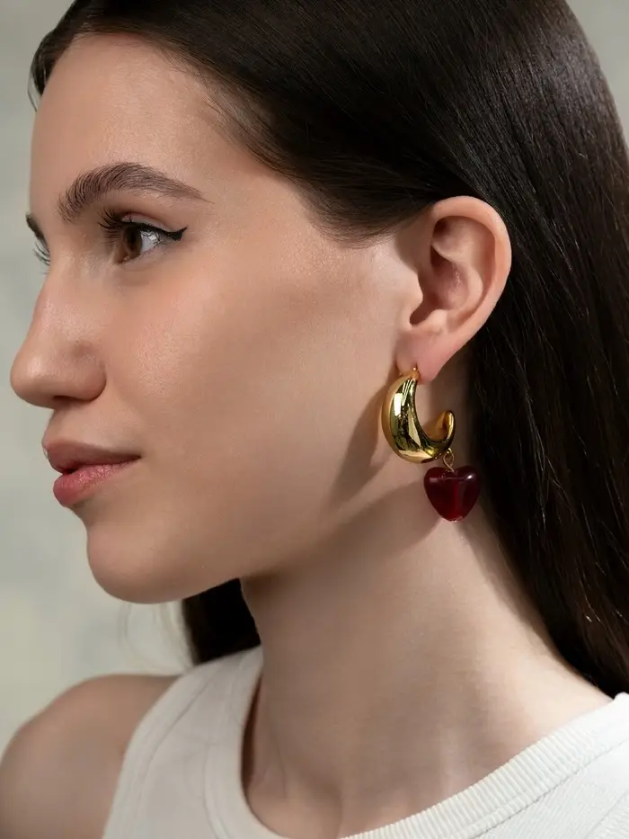 Смелые и страстные серьги с эмблемой сердца порадуют поклонников свежих и необычных украшений. Компактные габариты и четкие линии воплощают дух романтики и современности. Изделия украшены стильными элементами из полистоуна глубокого бордового оттенка, сверкающего на солнце подобно драгоценностям. Тончайшие контуры очерчены золотистой окантовкой, что придает вещице дополнительный шарм и элегантность. Подходят как женщинам, так и девушкам, ищущим необычные способы выразить свою личность.