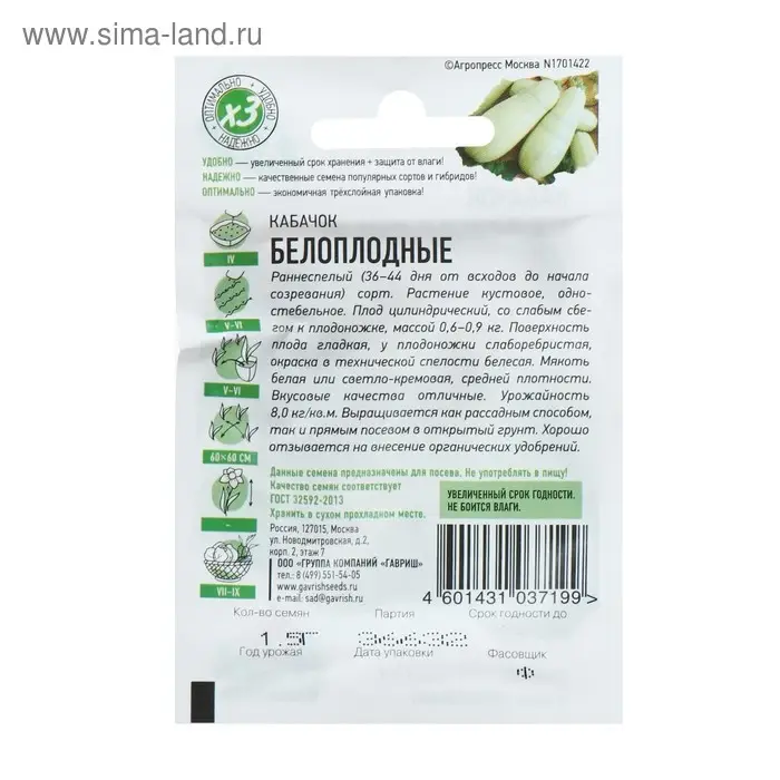 Раннеспелый (36–44 дня от всходов до начала созревания) сорт. Выращивается как рассадным способом, так и прямым посевом в грунт. Растение кустовое, одностебельное. Плод цилиндрический, со слабым сбегом к плодоножке, массой 0,6–0,9 кг. Поверхность плода гладкая, у плодоножки слаборебристая, окраска в технической спелости белесая. Мякоть белая или светло-кремовая, средней плотности. Вкусовые качества отличные. Посев на рассаду — в апреле, высадка рассады в грунт — в мае–июне. Посев непосредственно в грунт — в конце мая–начале июня. Хорошо отзывается на внесение органических удобрений. Схема посадки: 60x60 см. Урожайность до 8,0 кг/м2.