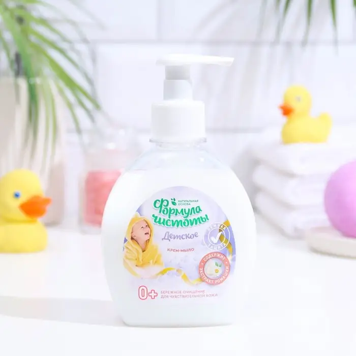 Жидкое туалетное мыло Формула чистоты Детское с ромашкой 250 мл. Крем-мыло жидкое дает устойчивую высокую пену. Прекрасно смывает любые загрязнения, в том числе животный и растительный жиры, машинные масла. Удаляет неприятные запахи. Бережно ухаживает и увлажняет кожу рук. Обладает приятными естественными ароматами. Не требует большого расхода.