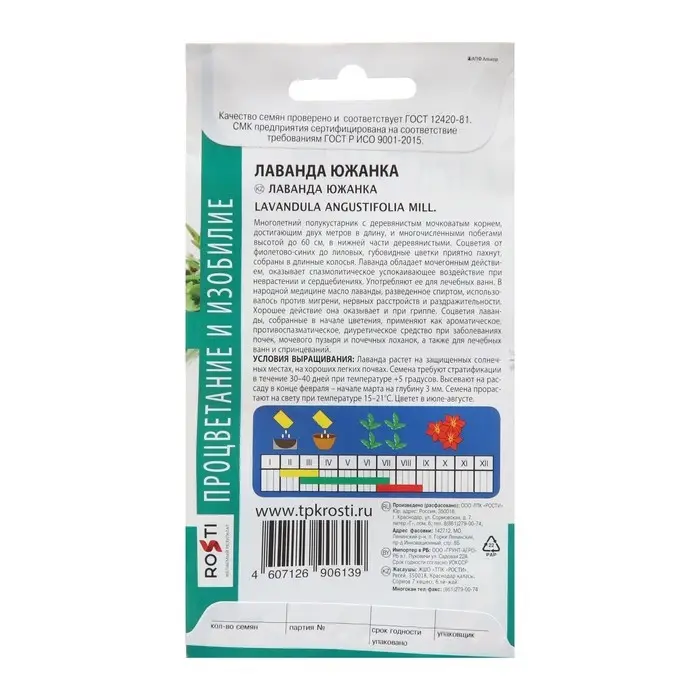 Лаванда растет на защищенных солнечных местах, на хороших легких почвах.Семена требуют стратификации в течение 30-40 дней при температуре +5°С.Высевают на рассаду в конце февраля - начале марта на глубину 3 мм.Семена прорастают на свету при температуре +15+21°С.Цветет в июле - августе.