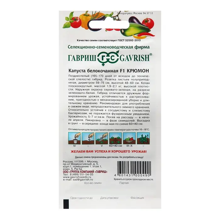 Капуста белокочанная Крюмон (Krymon) – это сорт капусты среднеспелый, предназначенный для выращивания в открытом грунте. Он отличается хорошей устойчивостью к болезням и неблагоприятным погодным условиям. Семена этого сорта капусты обладают высокой всхожестью и хорошими агротехническими свойствами. Крюмон формирует компактные, плотные кочаны белого цвета, которые хорошо транспортируются и долго хранятся.