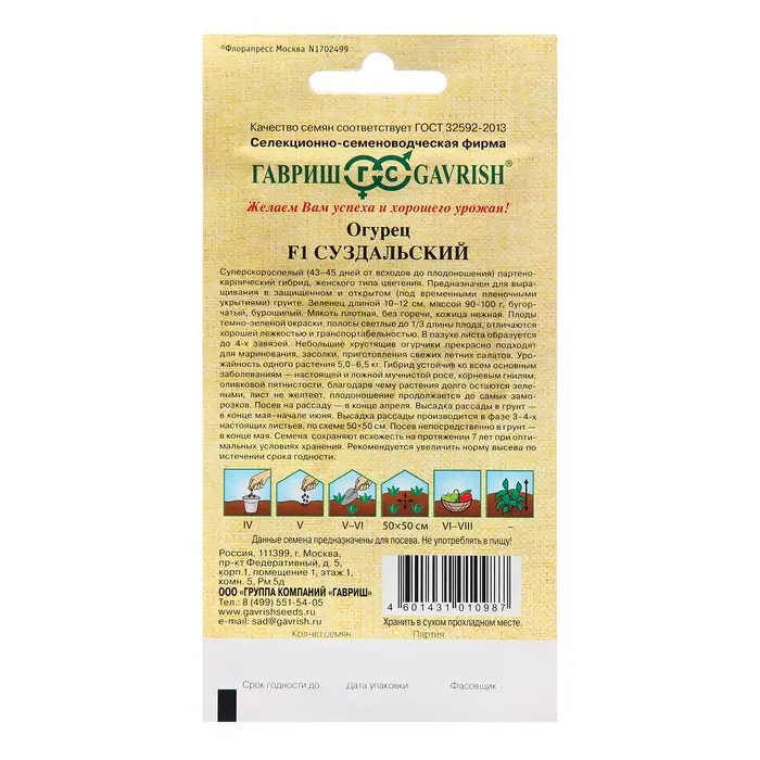 Очень скороспелый (43-45 дней от всходов до плодоношения) партенокарпический гибрид, женского типа цветения. Предназначен для выращивания в защищенном грунте и в открытом под временными пленочными укрытиями. Посев на рассаду в конце апреля. Высадка рассады в грунт в конце мая – начале июня. Высадка рассады производится в фазе 3-4-х настоящих листьев, по схеме 50х50 см. Посев непосредственно в грунт – в конце мая. Зеленец длиной 10-12 см, массой 90-100 г, крупнобугорчатый, бугорки красивые, четкие, бурошипый. Мякоть плотная, без горечи, кожица нежная. Плоды темно-зеленой окраски, полосы светлые до 1/3 длины плода, отличаются хорошей лежкостью и транспортабельностью. В пазухе листа образуется до 4-х завязей. Небольшие хрустящие огурчики прекрасно подходят для маринования, засолки, приготовления свежих летних салатов. Гибрид устойчив ко всем основным заболеваниям - настоящей и ложной мучнистой росам, корневым гнилям, оливковой пятнистости, благодаря чему растения долго остаются зелеными, лист не желтеет, плодоношение продолжается до самых заморозков. Урожайность одного растения 5,0-6,5 кг.