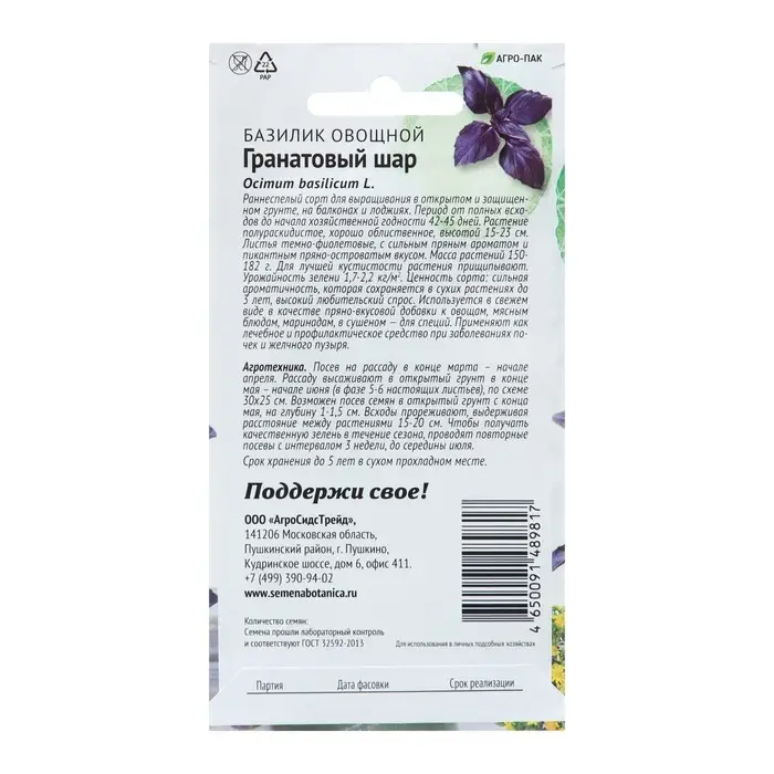 Семена Базилик "Гранатовый Шар" овощной, 0,25 г