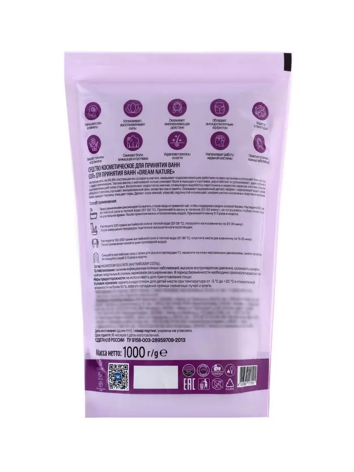 DREAM NATURE SPA CARE Английская соль для ванн, 1 кг — натуральный источник магния (99,9%), обеспечивающий комплексный уход за телом и волосами. Соль подходит для ванн, ванночек для рук и ног, а также для скрабов для тела и волос.