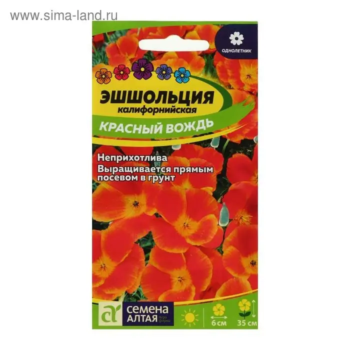 Декоративно-цветущий однолетник с тонко-рассеченной нежной, сизого оттенка листвой и контрастными полумахровыми бордово-красными цветками с желтым глазком в центре. Растение до 35 см высотой. Эшшольция придает легкость и изящность цветникам, клумбам, каменистым горкам, мавританским газонам. Цветет обильно с июня по сентябрь. Растение светолюбивое, холодо- и засухоустойчивое, предпочитает легкие дренированные почвы. Отзывчиво на полив и внесение удобрений (кроме свежих органических).