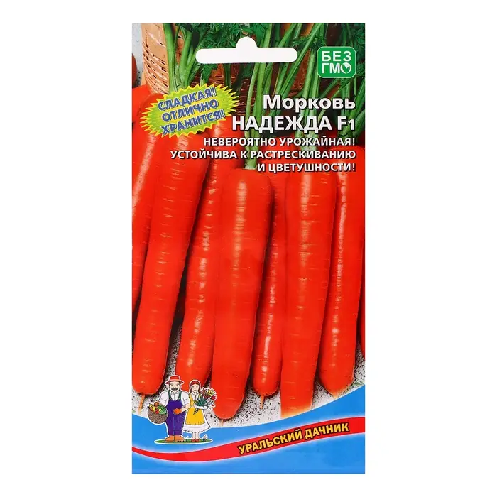 Морковь столовая Надежда F1 среднеспелый гибрид, сортотип Нантская. Лежкий, от всходов до уборки 95 - 100 суток. Пучковую морковь убирают через 50-60 суток. Корнеплод гладкий, длиной 14 - 16 см, массой 140 г, цилиндрический, ярко-оранжевый, сладкий и ароматный, исключительно сочный, с содержанием каротина 16 - 18 мг %. Идеален для переработки на сок, детское питание. Способен формировать высокий урожай на разных типах почвы. Урожайность 8 - 10 кг/м2. Схема посева: 20 х 5см.